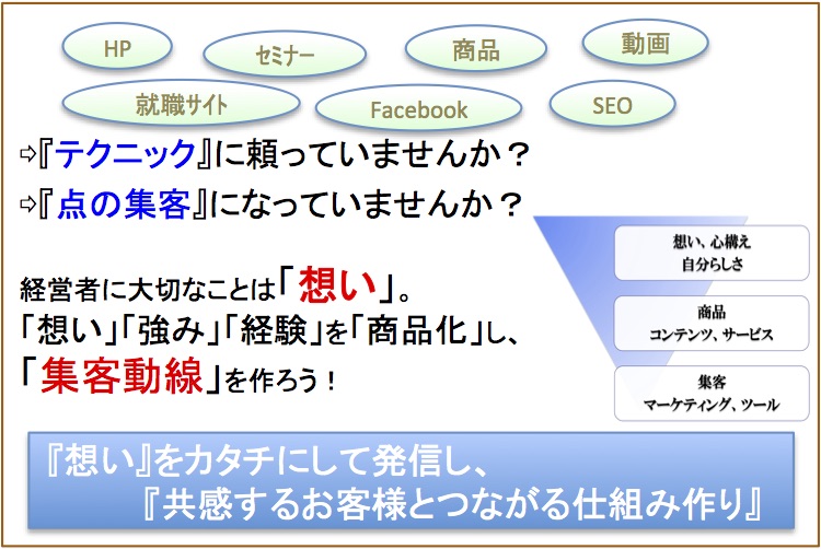 あなたの「想い」がお客様や従業員の心を動かします。感動を与えます。「想い」「強み」「経験」を詰め込んだ商品こそお客様のためになるのです。「この人の商品を買いたい」「サービスを受けたい」「この人と働きたい」と感じてもらうことが集客の問題解決の本質であると考えます。