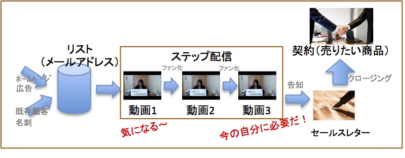 YouTubeに代表されるように動画が手軽に活用できる時代になってきました。リストを集め、そのリストの方々に対し動画を活用してお客様に先に価値を提供することで、信頼関係を構築することが目的です。